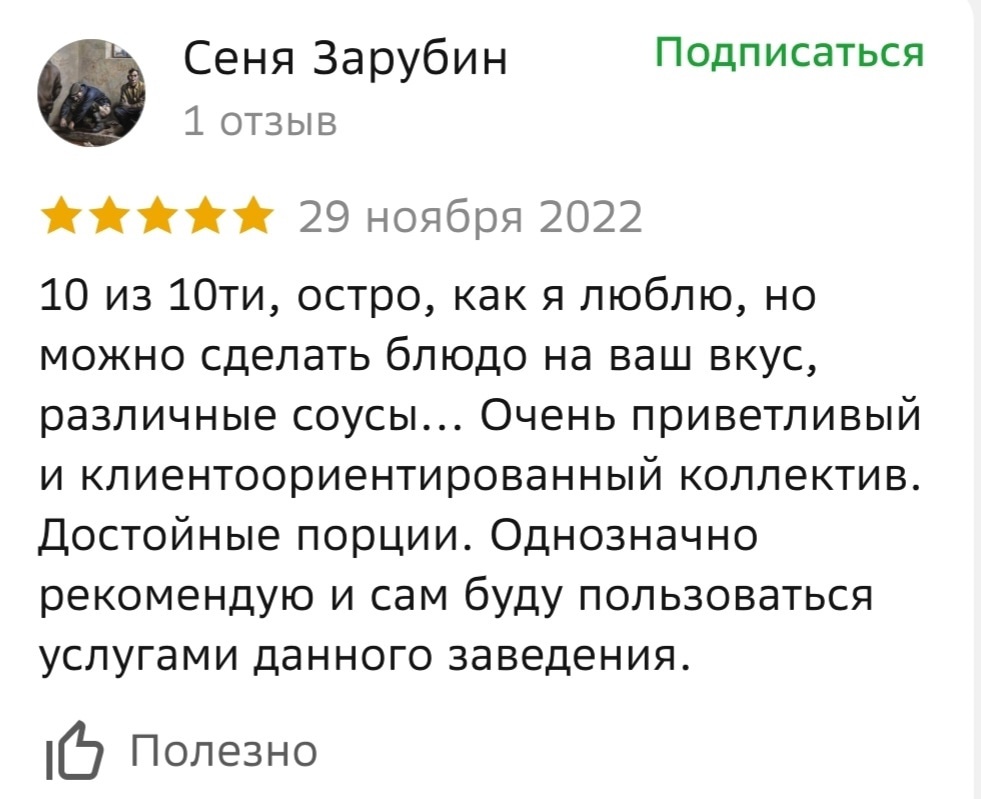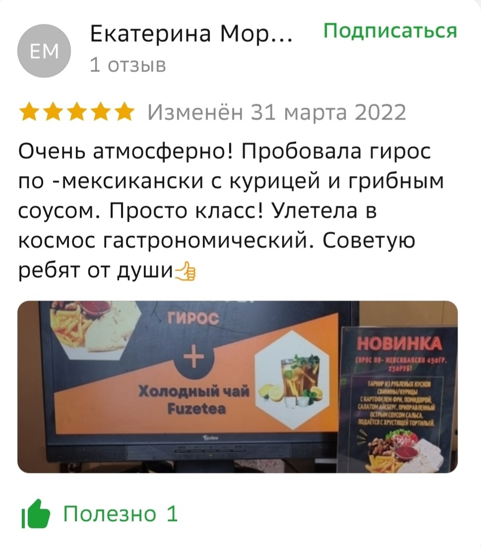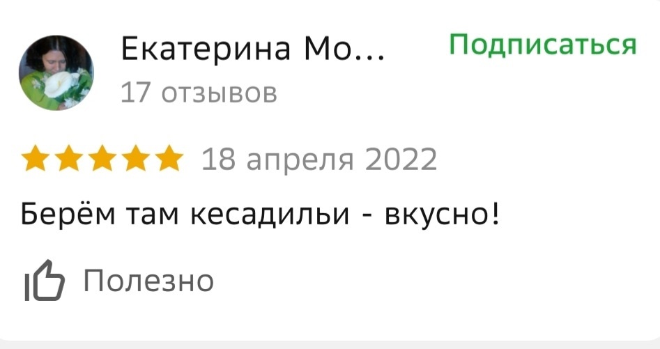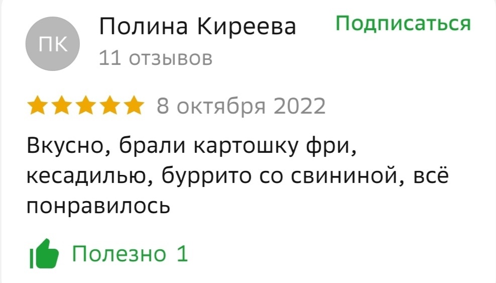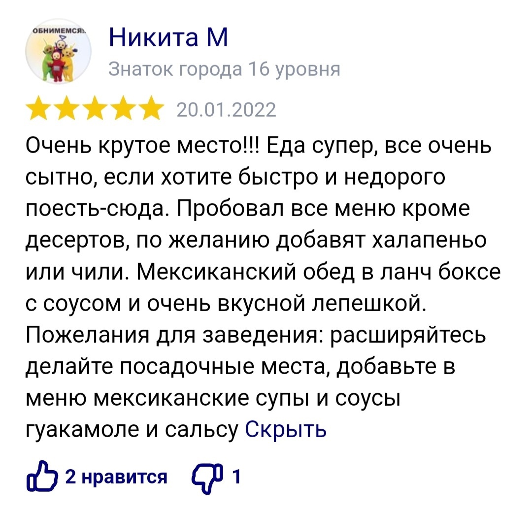 Марина21 марта 2025Введите в меню кукурузные лепешки, очень не хватает)